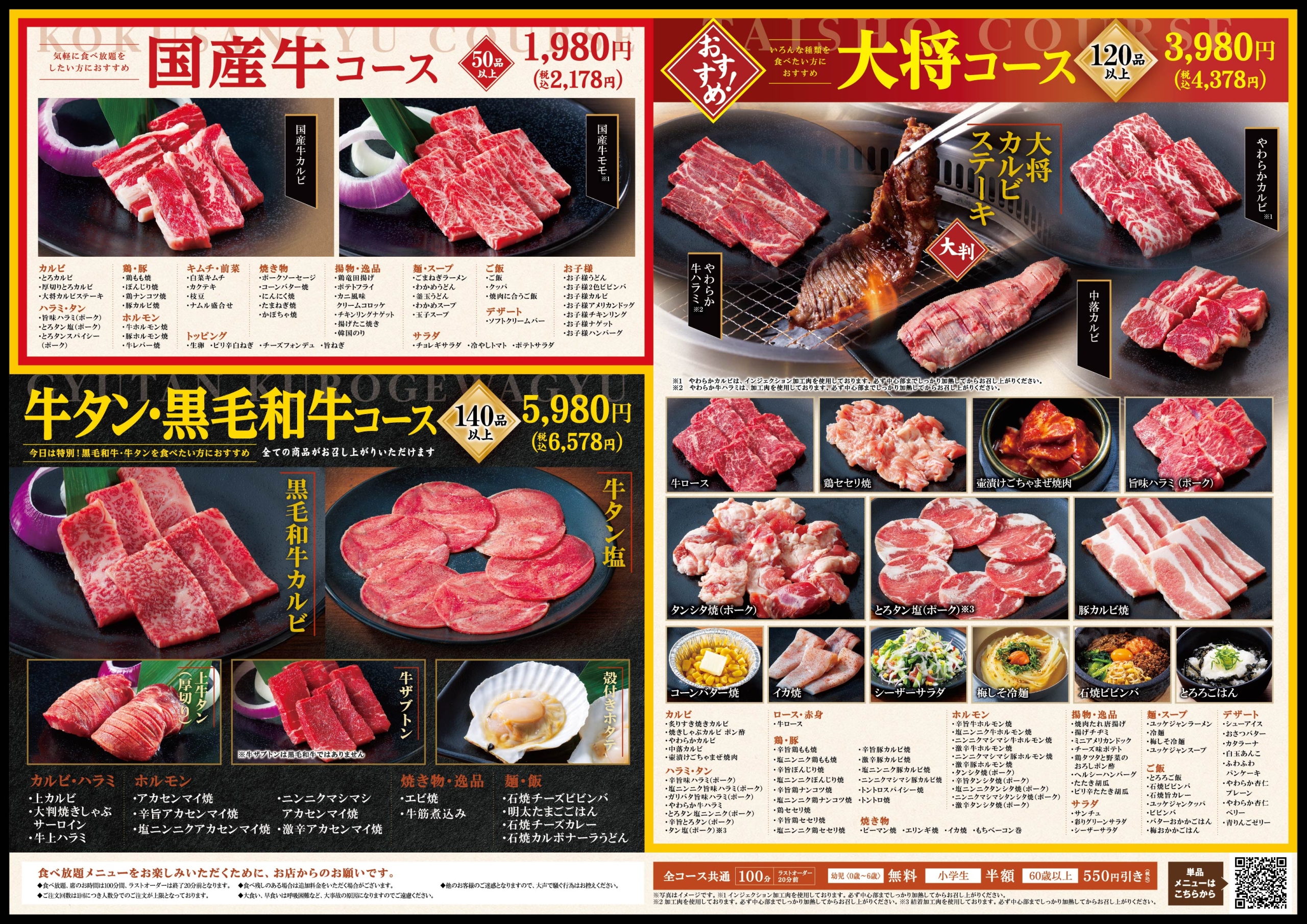さらにカルビ大将では小学生以下は半額、幼児は無料、60歳以上は550円引きの年齢割を設けているので、家族でお得に食べ放題が楽しめる料金設定となっております。