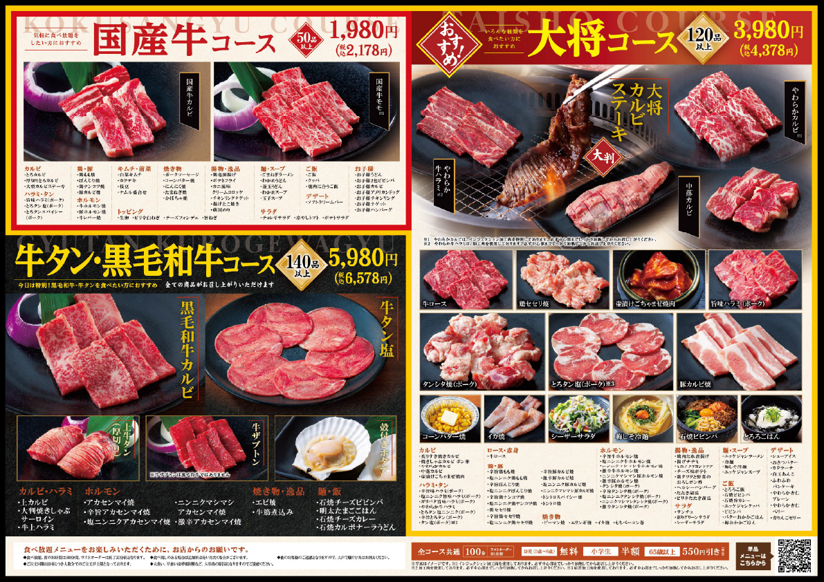さらにカルビ大将では小学生以下は半額、幼児は無料、60歳以上は550円引きの年齢割を設けているので、家族でお得に食べ放題が楽しめる料金設定となっております。