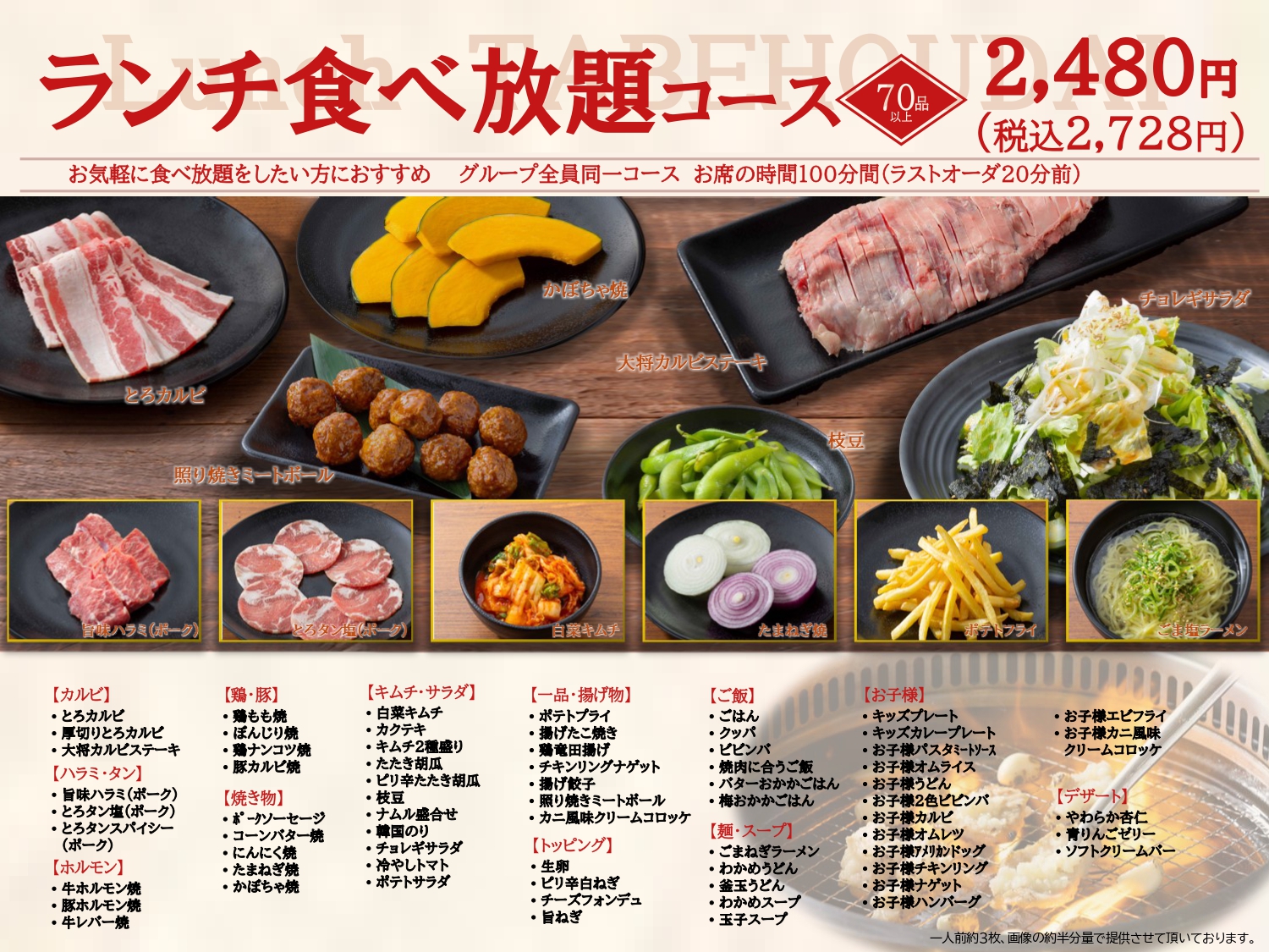 カルビ大将TOPメニュー【食べ放題】ランチ食べ放題コース 【食べ放題】ランチ食べ放題コースmenu 食べ放題コース一覧 アラカルト 【食べ放題】牛タン・黒毛和牛コース 【食べ放題】上カルビ・国産牛コース 【食べ放題】大将コース 【食べ放題】お手軽コース キッズメニュー ランチ定食メニュー 【食べ放題】ランチ食べ放題コース 【ドリンクメニュー】 アレルゲン情報 アレルゲン情報(高山店限定) メニュー 一覧へ戻る
